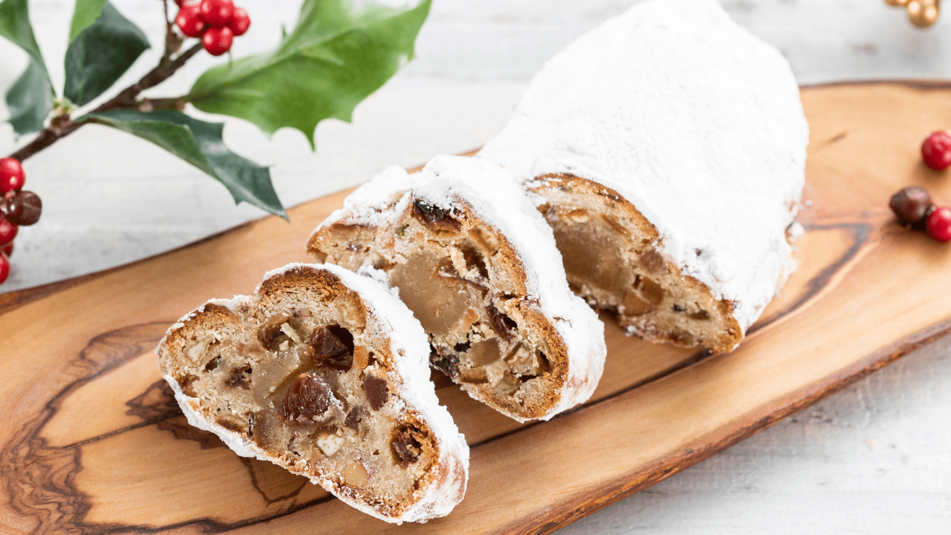 If fruitcake feels heavy and nostalgic, Stollen is its gentler, more festive cousin. Originating from Germany, Stollen is a soft bread-like cake packed with dried fruits, nuts, spices, and usually a giant strip of marzipan running through the center.