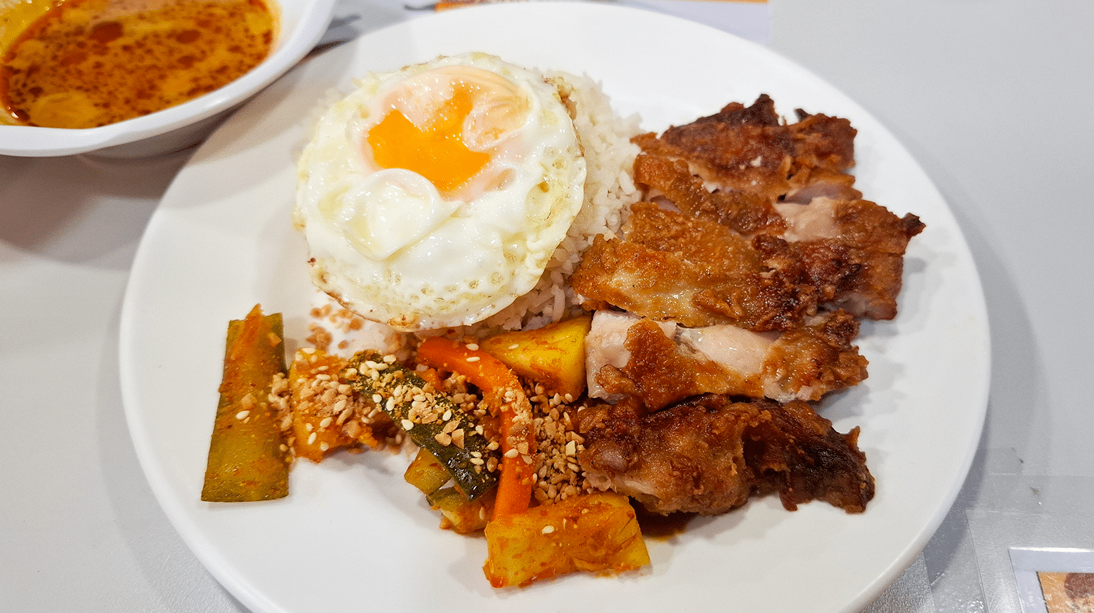 The egg was fried just right with a slightly runny yolk that mixed beautifully with the rice. It’s the kind of detail that makes you appreciate a simple dish even more. The rice itself was plain white but what stood out was the small addition of pineapple pickle on the side. It was sweet, tangy, and refreshing, cutting through the richness of the fried chicken and keeping every bite interesting.