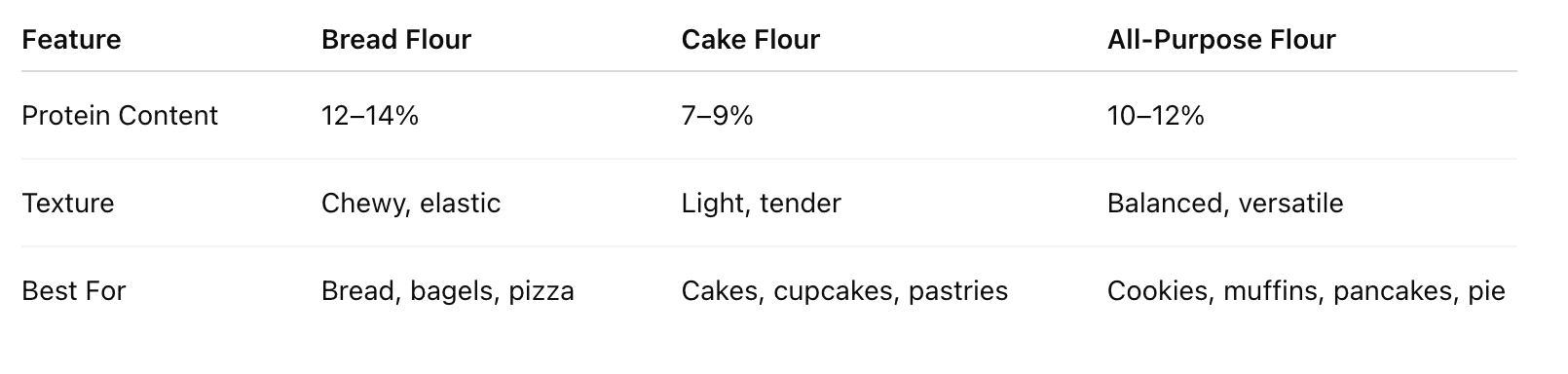 Bread flour is the high-protein superstar. It usually has around 12–14% protein, which is higher than all-purpose (around 10–12%) and much higher than cake flour (around 7–9%).