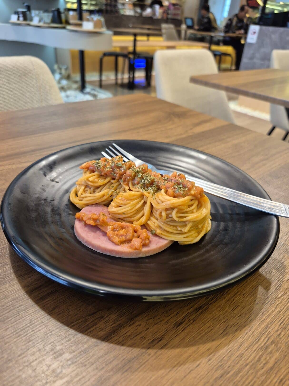 Instead of traditional meatballs or bacon, the dish includes a slice of pink beef luncheon meat underneath the pasta. Visually, it’s appealing—neatly plated for a café setting. The sauce looks chunky and well-seasoned, but the use of Ma-Ling luncheon meat makes the dish feel more budget-friendly rather than indulgent. A fork is placed thoughtfully alongside, inviting you to dig in.