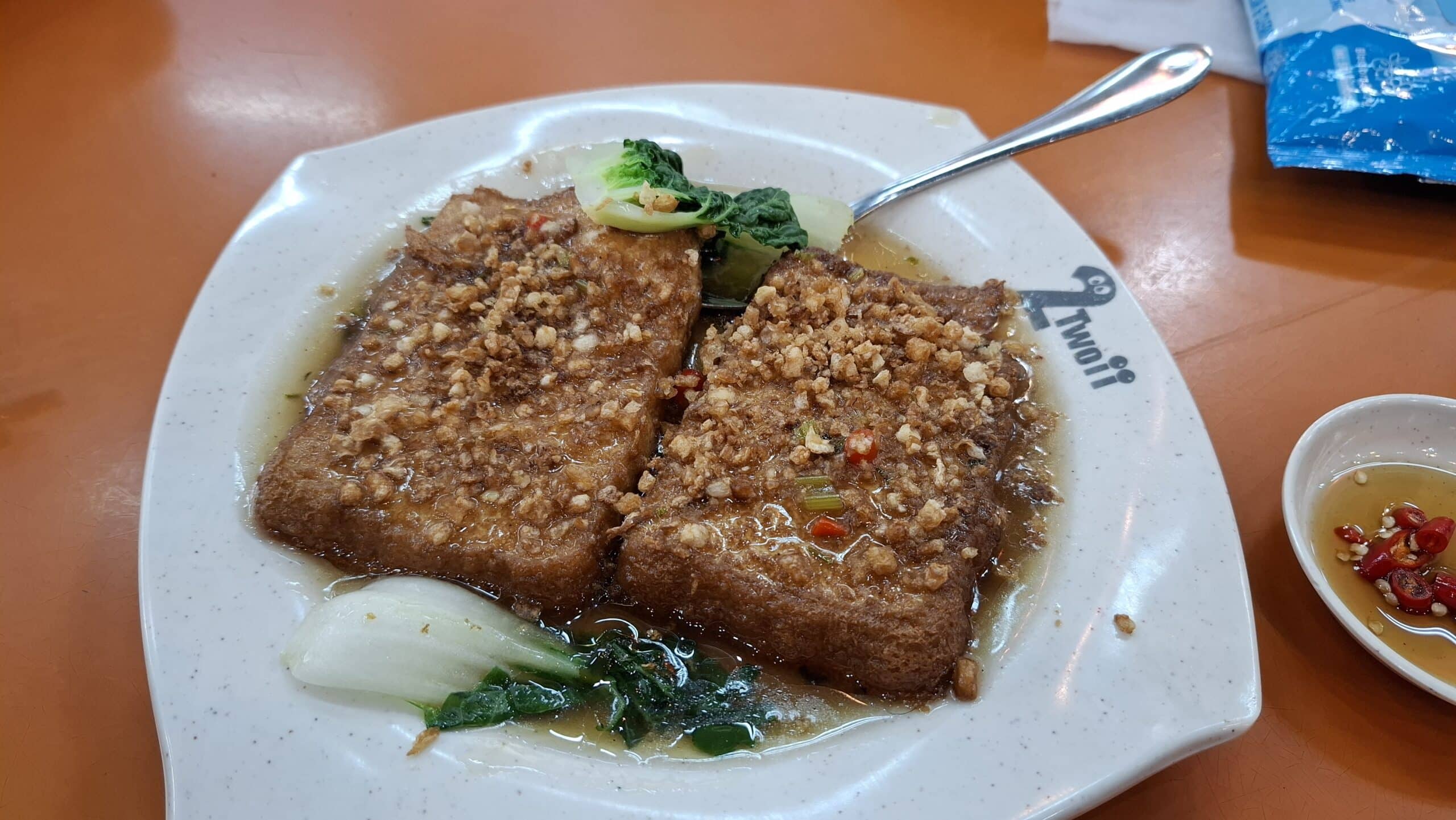 Soft tofu topped with preserved radish and egg bits, a little salty, a little umami. It’s one of those comforting dishes that feels like a home-cooked meal.